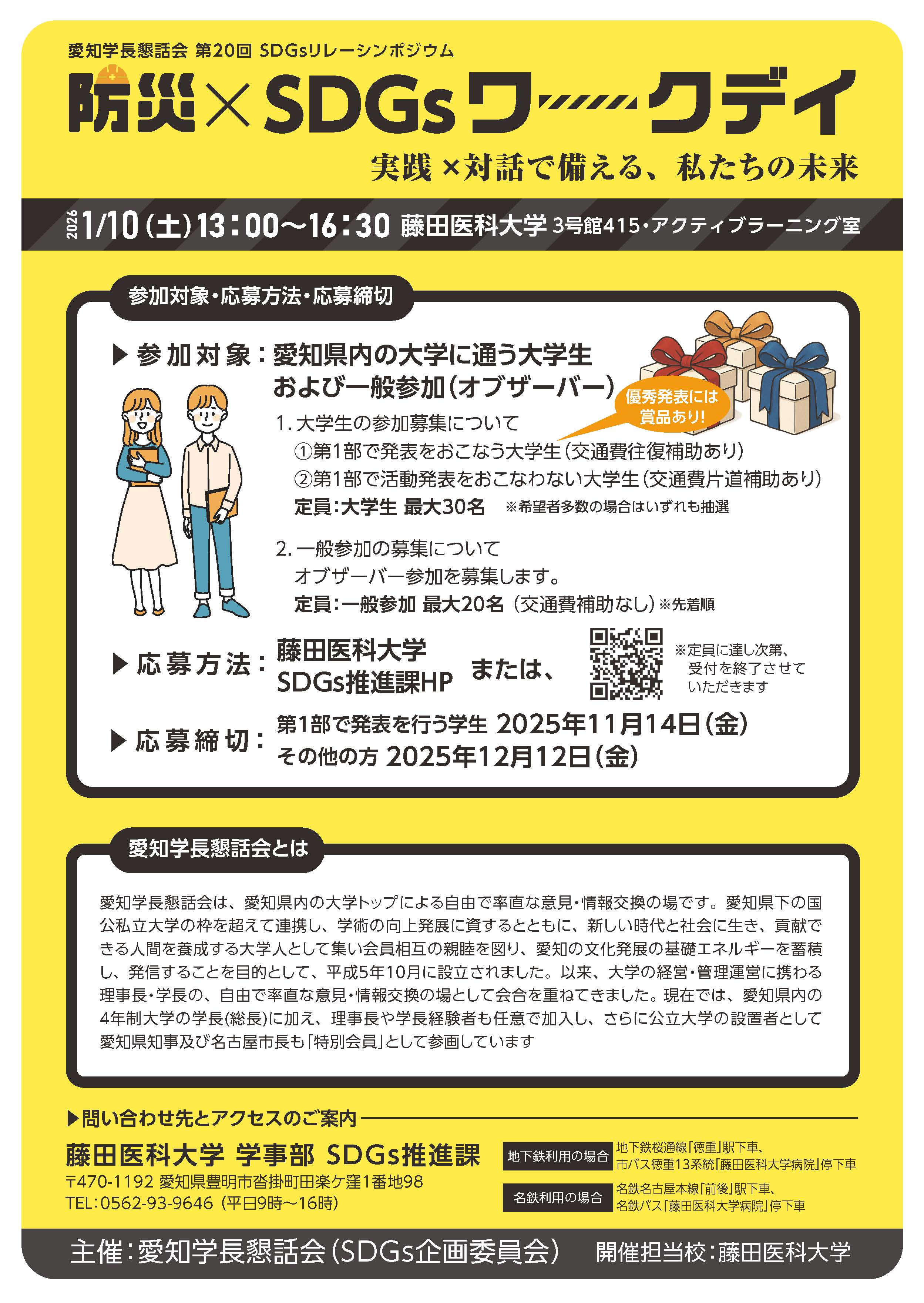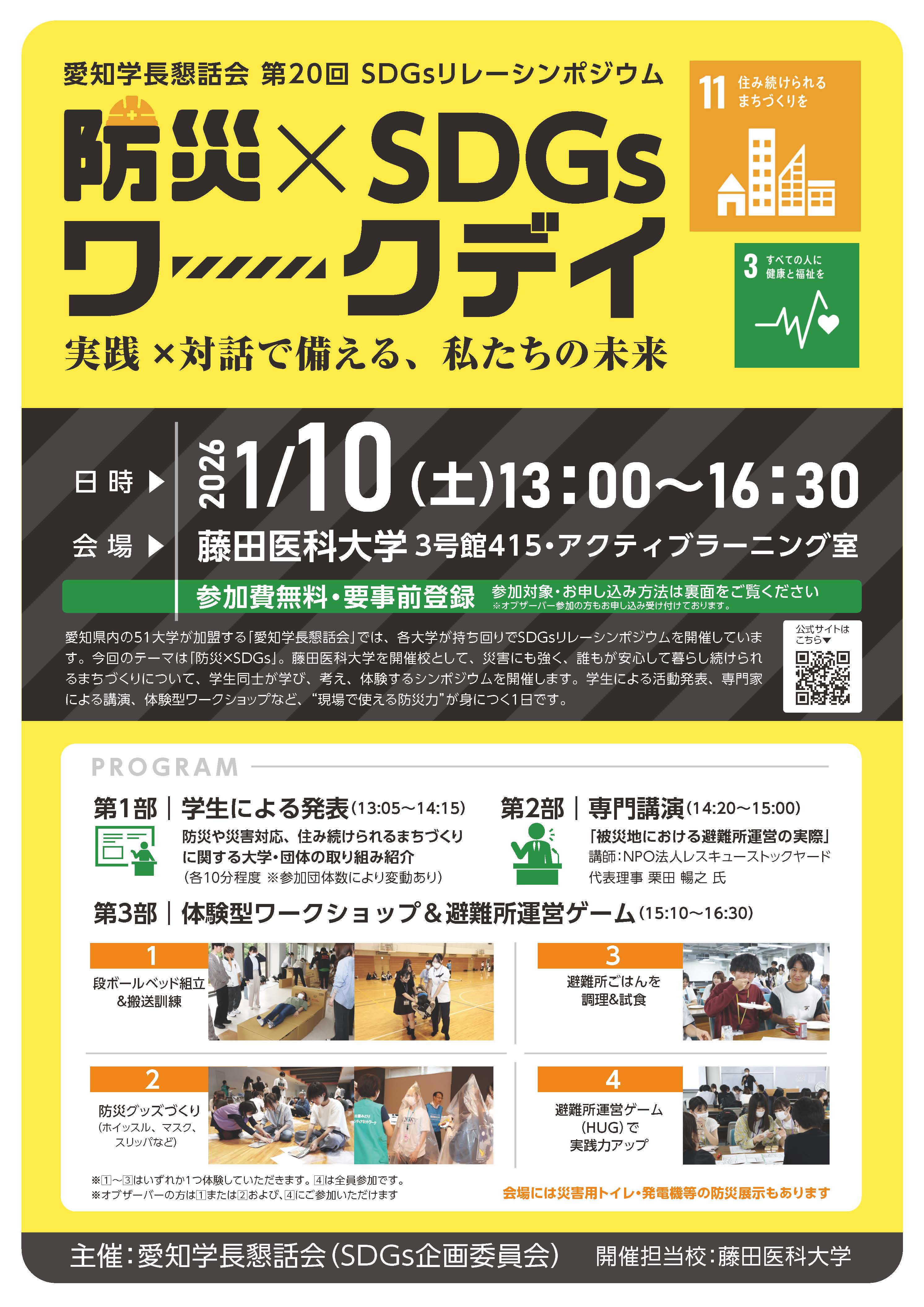 愛知県内の51大学が加盟する「愛知学長懇話会」では、各大学が持ち回りでSDGsリレーシンポジウムを開催しています。本回のテーマは「防災×SDGs」。藤田医科大学を開催校として、災害にも強く、誰もが安心して暮らし続けられるまちづくりについて、学生同士が学び、考え、体験するシンポジウムを開催します。学生による発表活動、専門家による講演、体験型ワークショップなど、“現場で考える防災力”が身につく1日です。